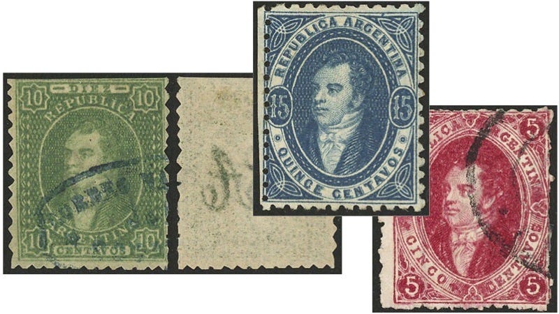 Guillermo Jalil is one of Argentina’s leading philatelists. Besides having co-written the definitive modern reference on his country’s stamps and postal stationery, Jalil’s firm, Philatino, holds regular auctions of better material. The upcoming Aug. 18 sale is a case in point: it consists solely of stamps from Argentina’s popular and well-studied second issue, known as the Rivadavias. Depicting Bernardino Rivadavia (1780-1845), the nation’s first president, these stamps were current from 1864-72. They were elegantly designed but their printing and perforating was somewhat on the primitive side, resulting in a lot of the kinds of varieties that can keep a diehard philatelist engaged for a lifetime.