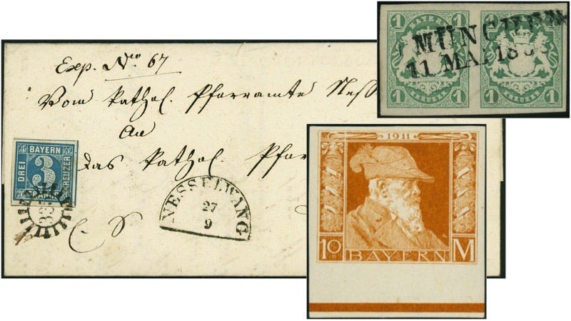 As I browsed through their listings—yes, lot descriptions are in German, but here again, if you collect this area, you probably have enough familiarity with the language to fathom the terminology—I was struck by the combination of high quality and very modest opening bids. I picked out three classic items from the state of Bavaria (shown above) that struck me as particularly beautiful and all priced in the €25-40 range. Again, the weak euro makes this an attractive time to buy.
