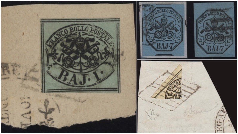 I zoomed in on three items from the Papal States, which refused to be annexed by Italy until 1870. This can be a tricky area to collect, as subtle gradations in quality can have a big effect on price—and many of the stamps were later reprinted for collectors.